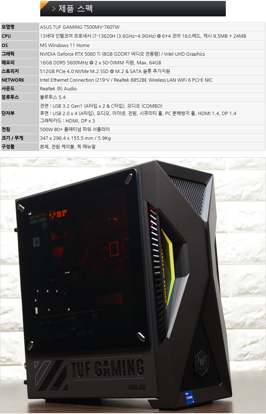 이번에 리뷰를 진행 할 ASUS TUF GAMING T500MV-760TW 는 작은 크기로 책상위에 편하게 올려두고 사용할 수 있는 게이밍 데스크탑 으로 게이밍 노트북 등에서 사용하는 13세대 인텔코어 프로세서 i7-13620H를 탑재해 발열을 최소화 하면서도 강력한 성능을 경험할 수 있으며 지포스 RTX 506 Ti 그래픽카드와 16GB DDR5 메모리를 사용해 최신 게임도 부드럽게 즐길 수 있다.