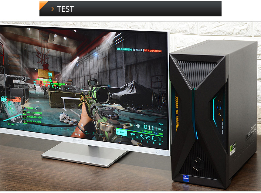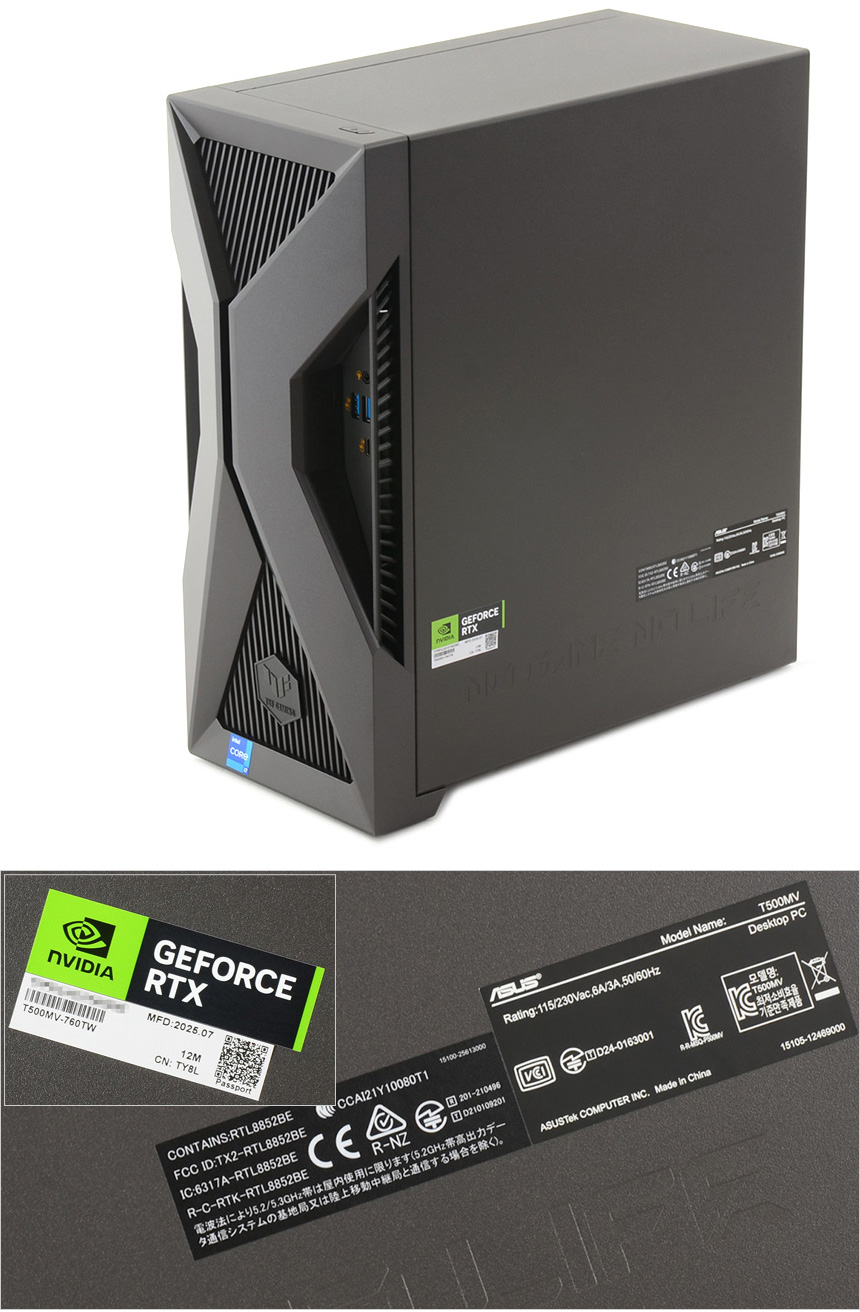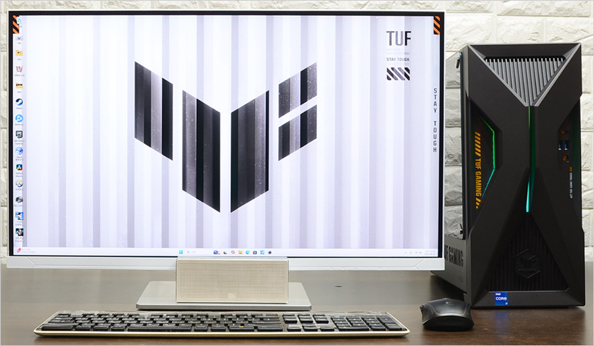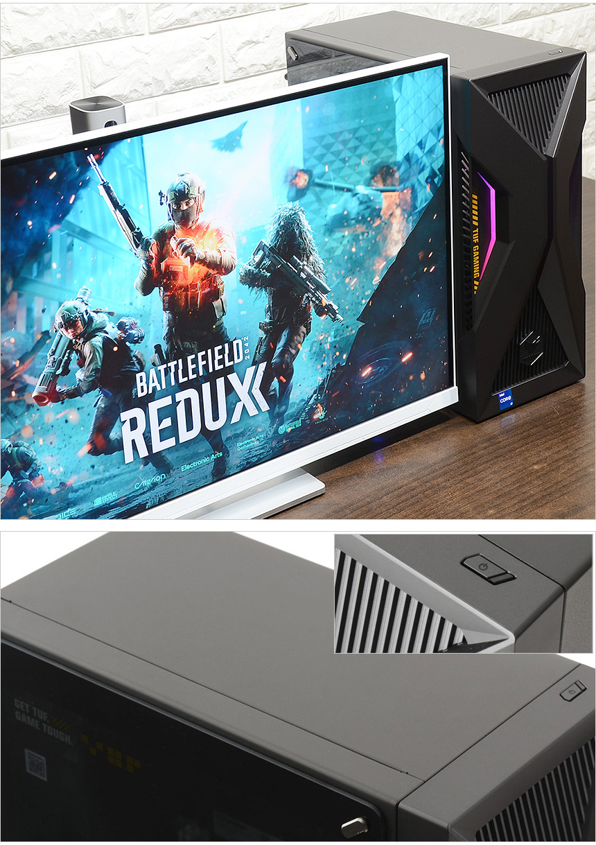 PC의 디자인은 게이밍 라인업인 TUF 시리즈의 최신작 답게 상당히 화려한 것을 확인할 수 있다. 로봇들이 주인공으로 나오는 메카 애니메이션에서 영감을 받은 디자인으로 최신 PC케이스들과 같이 투명한 측면 패널에 조명을 적용해 디자인 만족감을 한층 높였으며 높은 마감완성도로 고급스러운 느낌을 자아낸다. (참고로 이 제품은 밀리터리 등급의 견고함을 자랑하는 모델로 MIL-STD-810H 기준을 충족한다. 극한의 환경에서도 안심하고 PC를 사용할 수 있다.)