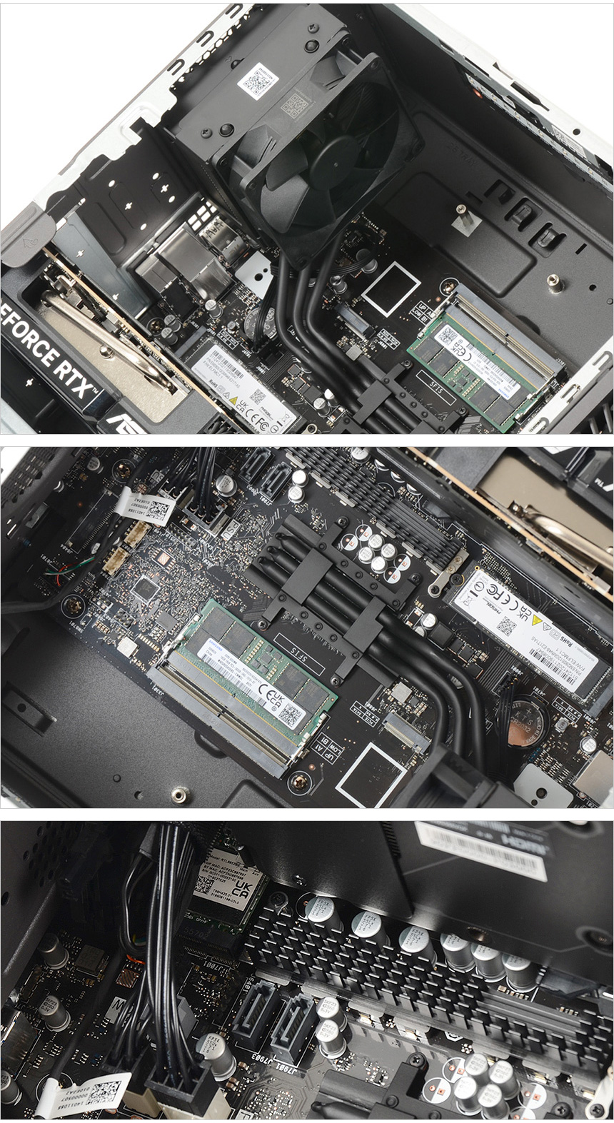 노트북에서 주로 사용되는 SO-DIMM 이 설치되어 있고 16GB DDR5 단일 메모리가 장착되어 손쉽게 메모리를 추가할 수 있다. 또한 512GB PCIe 4.0 NVMe SSD 가 장착되어 있을 뿐만 아니라 2280 규격의 M.2 슬롯이 추가로 제공되며 SATA 단자도 지원해 SSD나 HDD 등을 손쉽게 추가할 수 있다.