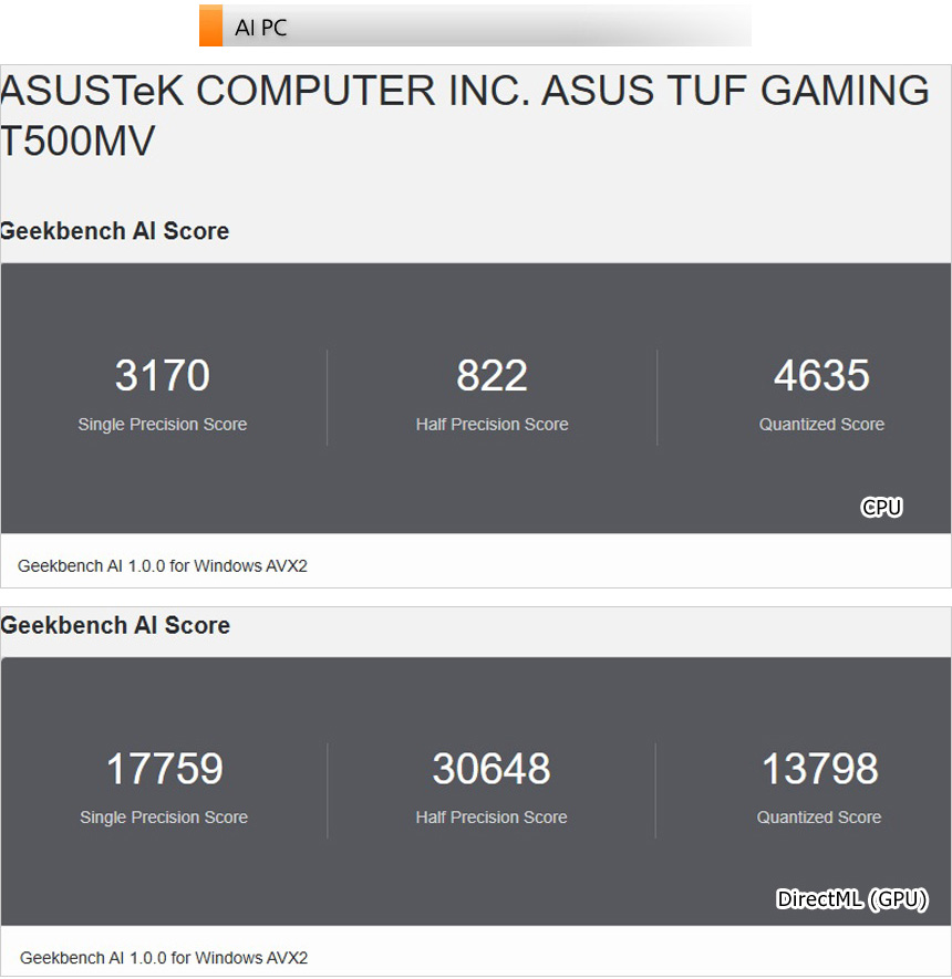 이 제품은 RTX 5060 Ti 그래픽카드가 장착되어 다양한 AI 애플리케이션을 편하게 활용할 수 있다. 상단의 사진은 긱벤치 AI를 이용해 성능을 확인하고 있는 모습으로 사무용 PC나 구형PC 대비 스코어가 상당히 높은 것을 확인할 수 있었다. (구형 그래픽카드를 탑재한 모델들과 분명한 차이를 보여주었다.)