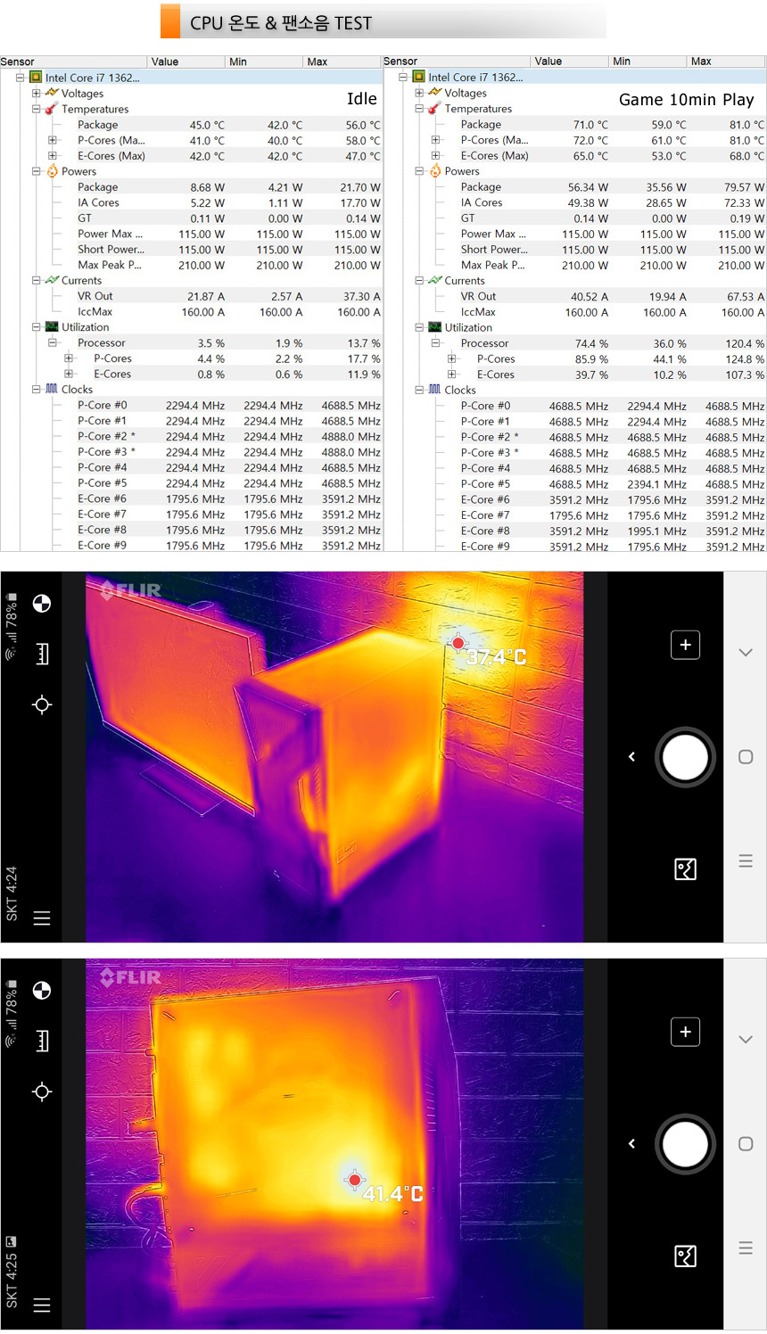 CPU 온도 테스트를 진행한 모습으로 (최고 성능모드, 실내온도 27도) 아무것도 하지 않는 Idle 상태에서는 40도 중반으로 동작했으며 게임을 10분 정도 플레이 하고 측정했을 때에는 70도 초반까지 온도가 올라가는 것을 확인할 수 있었다. 또한 열화상 카메라를 이용해 게임 실행시 열분포를 확인해 보았는데 통풍구와 그래픽카드가 뜨거운 것을 확인할 수 있다. (벽과 충분히 떨어진 상태에서 PC를 설치하기 바란다.)