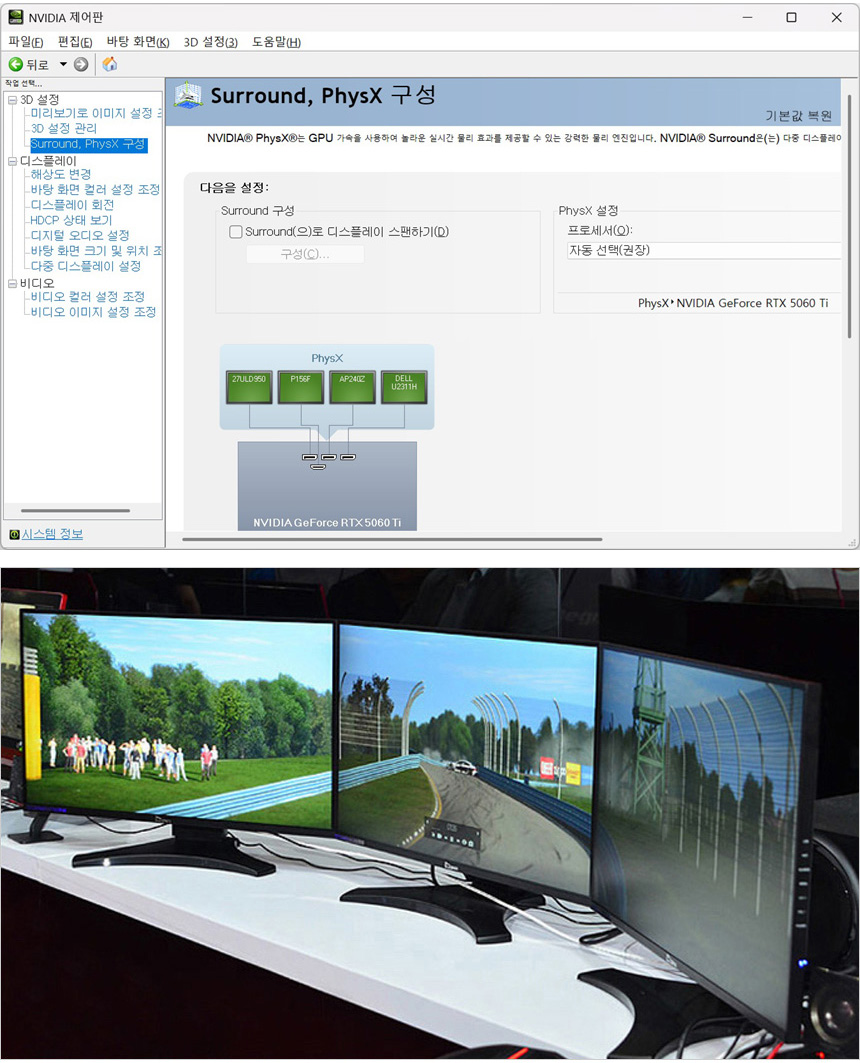 서라운드 모드 설정도 가능하다. 엔비디아 제어판에서 디스플레이 스팬을 선택후 설정하면 3개의 디스플레이에 동일한 화면이 출력되어 박진감 넘치는 게임 환경을 구성할 수 있다. (서라운드 뷰 기능은 슬림 배젤이 적용된 동일 모니터를 사용했을 때 효과를 극대화 할 수 있다.)