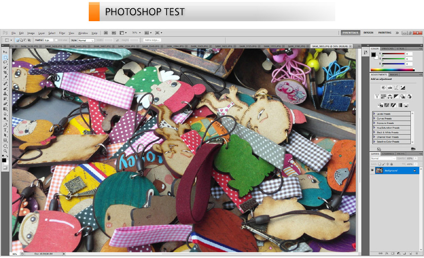 포토샵을 이용해 원본사진의 편집 테스트를 진행하고 있는 모습으로 고성능 PC답게 부드럽게 작업할 수 있었다. 고화질 모니터를 연결하면 디자인이나 전문 그래픽 작업 용도로 사용할 수 있다. @ 46장의 원본 사진 (총 180MB) 을 로딩하는데 걸리는 시간을 측정했는데 17초가 소요되었다.