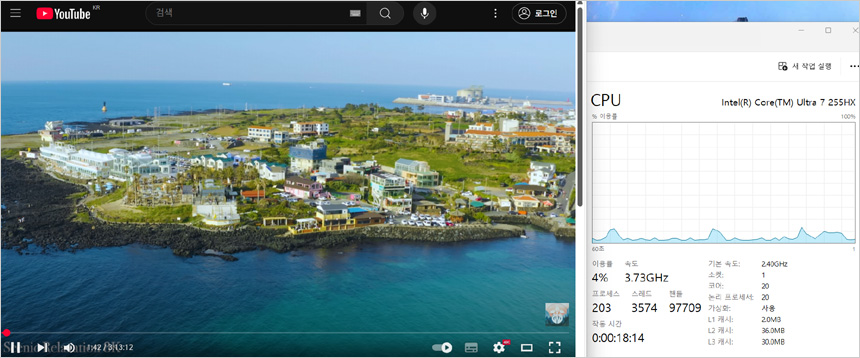 유튜브 고화질 동영상을 이용해 CPU 점유율을 테스트 하고 있는 모습으로 (2160P@60FPS) 3-11% 대의 점유율을 보여 주었으며 인터넷을 실행했을 때 20% 후반까지 점유율이 올라가는 것을 확인할 수 있었다.