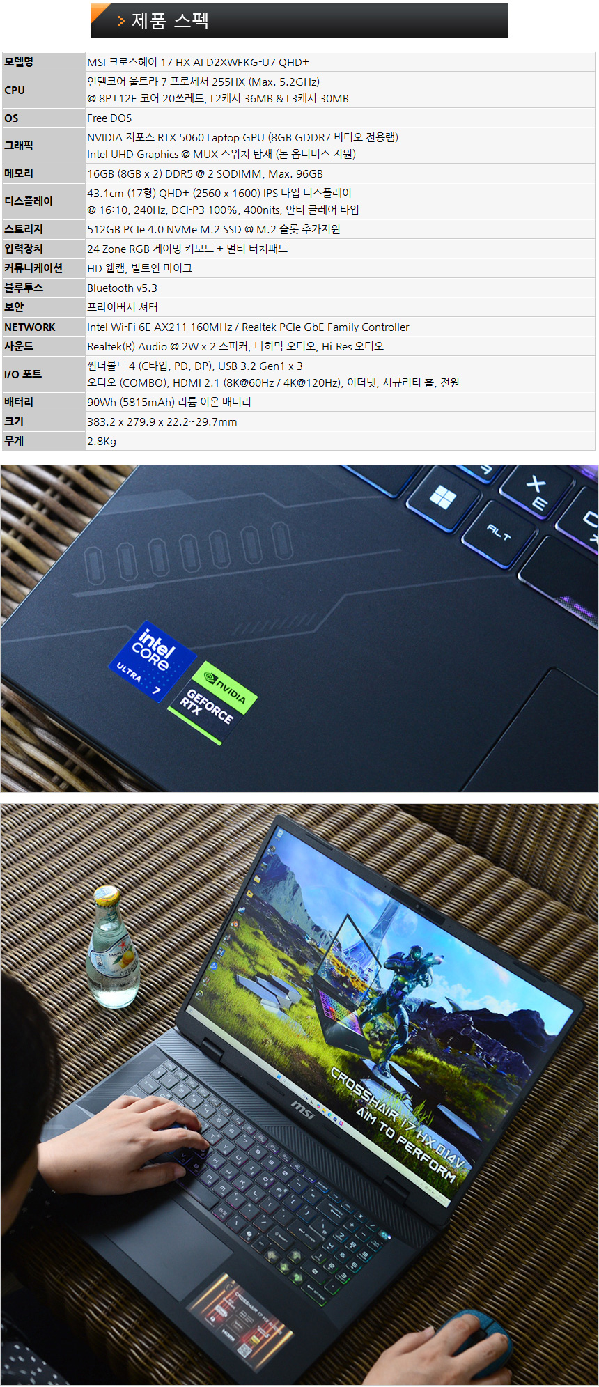 이번에 리뷰를 진행 할 MSI 크로스헤어 17 HX AI D2XWFKG-U7 QHD+ 는 다용도로 사용할 고성능 노트북이 필요한 유저들을 위한 제품으로 데스크탑용 CPU에 버금가는 강력한 성능을 가진 인텔코어 울트라 7 프로세서 255HX를 탑재해 게임은 물론 랜더링과 같은 전문작업용으로 사용할 수 있으며 RTX 5060 랩탑 GPU가 장착되어 QHD+ 해상도에서도 상위 옵션으로 게임을 플레이 할 수 있다.