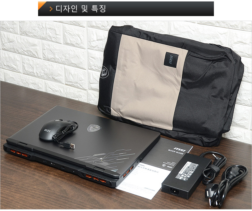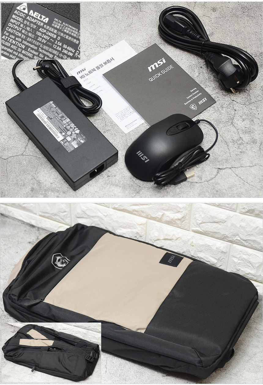 풀KIT 의 모습으로 노트북을 비롯해 240W 전원 어댑터와 전원 케이블을 제공하며 퀵 매뉴얼과 보증서가 포함되어 있다. 또한 전용 백팩을 제공해 편하게 휴대할 수 있으며 게이밍 마우스도 지원한다.