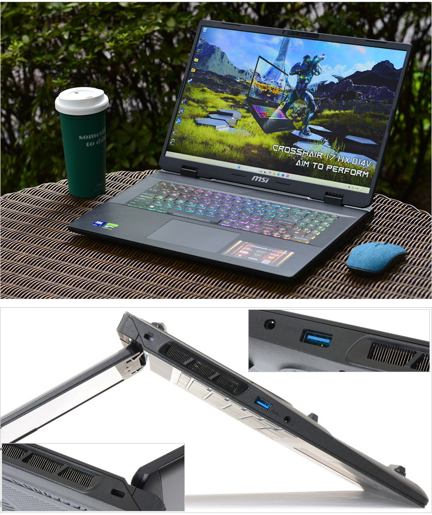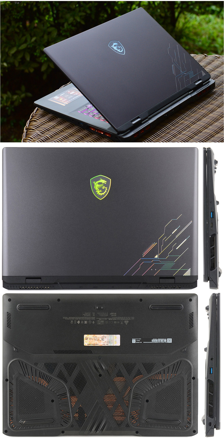 노트북의 디자인은 상당히 깔끔하고 세련된 것을 확인할 수 있다. 미래형 우주선을 모티브로 한 새로운 스타일의 제품으로 무광 마감에 홀로그램을 적용한 것이 인상적이며 (빛의 방향에 따라 로고와 라인의 컬러가 달라진다.) 24존 RGB 키보드를 적용해 화려함 조명 효과를 즐길 수 있다. 특히 지문이나 먼지등이 잘 묻어나지 않아 깔끔하게 노트북을 관리할 수 있다.