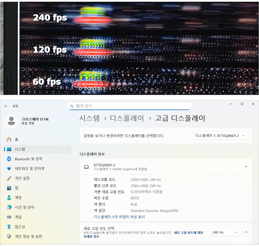 120Hz 나 144Hz 주사율을 지원하는 일반 게이밍 노트북과 달리 240Hz 주사율 지원으로 더 부드러운 영상을 즐길 수 있다. 상단의 사진은 하위 프레임과 같이 재생되는 영상 (960 Pixel Per Sec) 을 셔터스피드 1/20 로 촬영한 모습으로 프레임이 낮을수록 캐릭터의 수가 적으며 프레임이 높아질수록 시간당 많은 화면이 뿌려지기 때문에 캐릭터의 수가 많은 것을 확인할 수 있다.