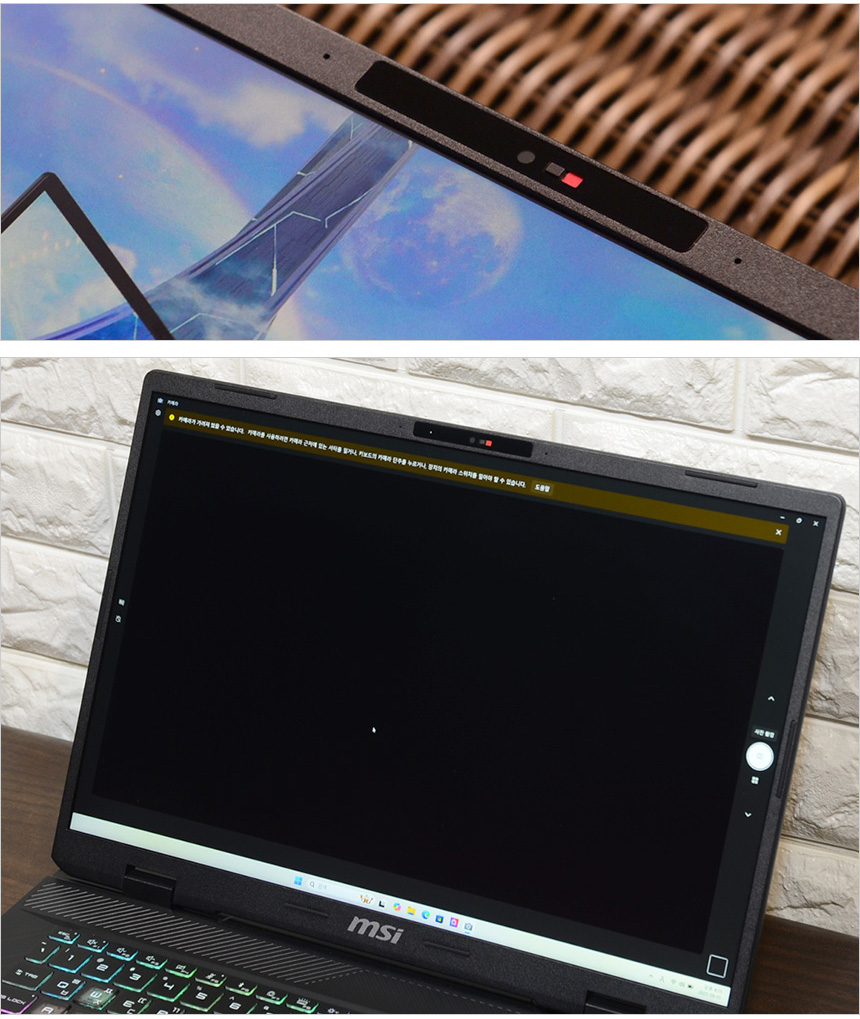 웹캠을 이용한 비주얼 해킹이나 사생활 침해를 원천적으로 차단할 수 있도록 카메라에 프라이버시 셔터가 장착된 것을 확인할 수 있다. 물리적으로 카메라를 가려주기 때문에 해킹으로 노트북 권한을 획득 하더라도 사용자나 주변 상황을 전혀 볼수 없다. (동영상을 통해 자세히 확인하기 바란다.)