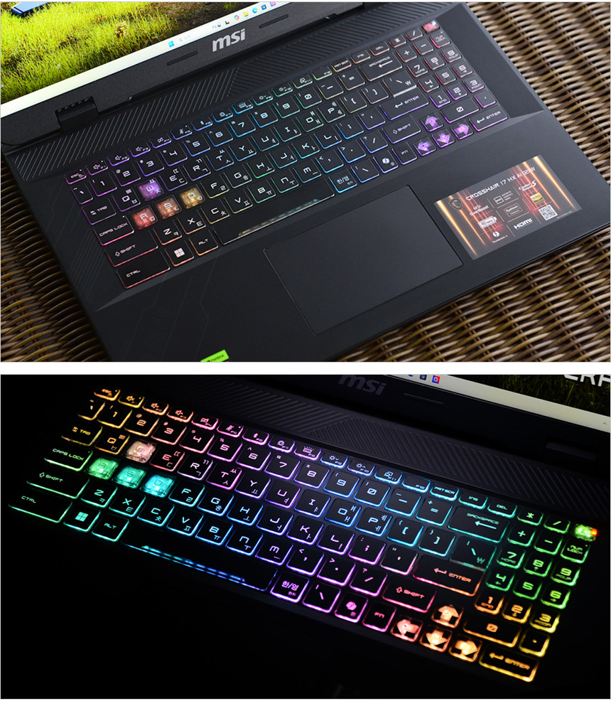 키보드 1열에는 마이크 비활성화, MSI 센터, 화면 및 키보드 조명밝기 등을 손쉽게 설정 할 수 있도록 핫키를 지원하며 우측 상단는 전원 버튼이 설치된 것을 확인할 수 있다. 또한 팜래스트 중앙에는 터치패드가 설치되어 마우스 사용이 힘든 외부에서도 손쉽게 노트북을 조작할 수 있다.