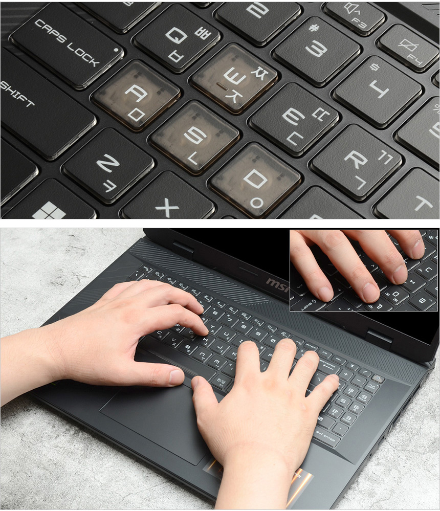 키보드의 모습으로 17형 대화면을 지원 노트북 답게 텐키가 포함된 풀사이즈 키보드가 장착되어 있다. 특히 키캡 테두리 부분까지 조명이 적용되어 확연한 구분감을 제공하며 단색의 백라이트를 지원하던 전작과 달리 24존 RGB 백라이트를 지원해 아름다운 조명 효과를 즐길 수 있었다. 또한 게이밍 노트북 답게 방향키와 WASD 키캡에 포인트를 주어 구분감을 높였다.