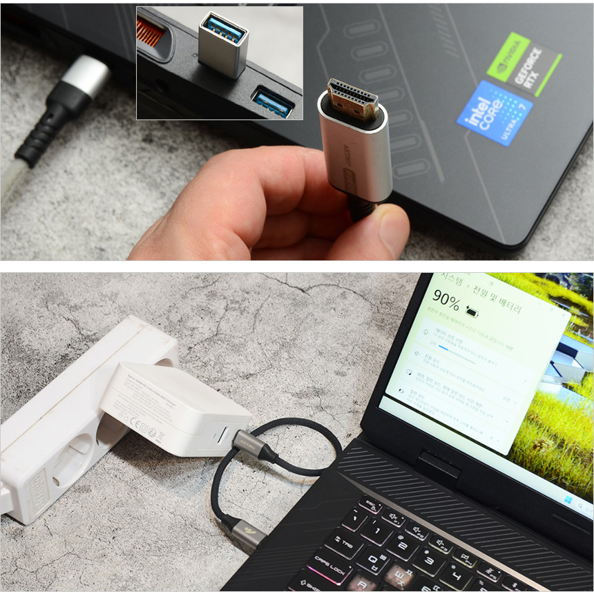 썬더볼트 4 단자는 디스플레이 출력을 지원해 고해상도 모니터를 연결해 사용할 수 있으며 젠더를 장착하면 A타입의 액세서리도 연결할 수 있다. 뿐만 아니라 PD충전도 지원해 전원 어댑터를 가지고 다니기 힘들 경우 작은 PD충전기를 이용해 전원을 공급할 수 있다. @ 고성능 게이밍 노트북이다. 65W 보다는 100W (단일출력) 이상의 PD 충전기 사용을 권장한다.