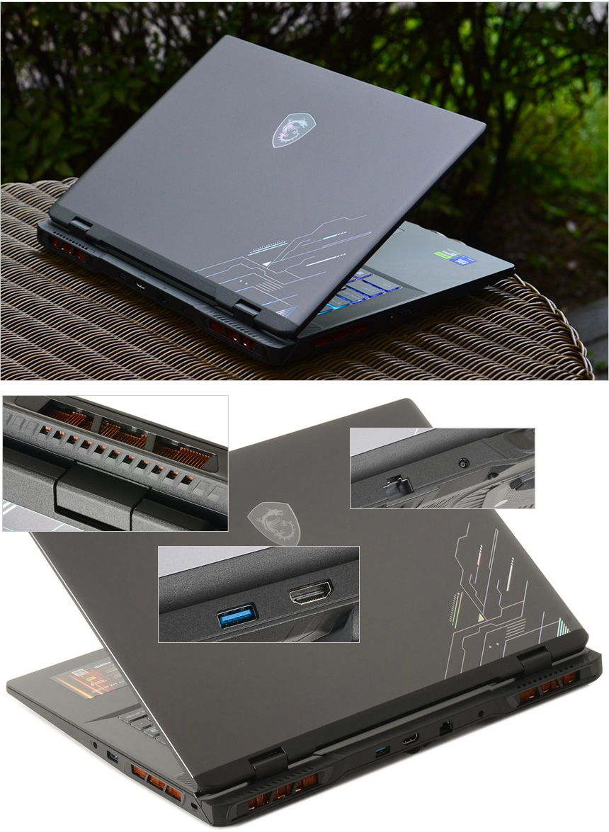 노트북 후면부의 모습으로 양 측면에 통풍구가 설치되어 있고 유선랜 사용을 위한 기가비트 이더넷 단자와 USB 3.2 Gen1 단자가 장착되어 있다. 또한 8K & 4K 고해상도 모니터 연결을 위한 HDMI 2.1 단자와 전원 단자가 설치된 것도 확인할 수 있다.