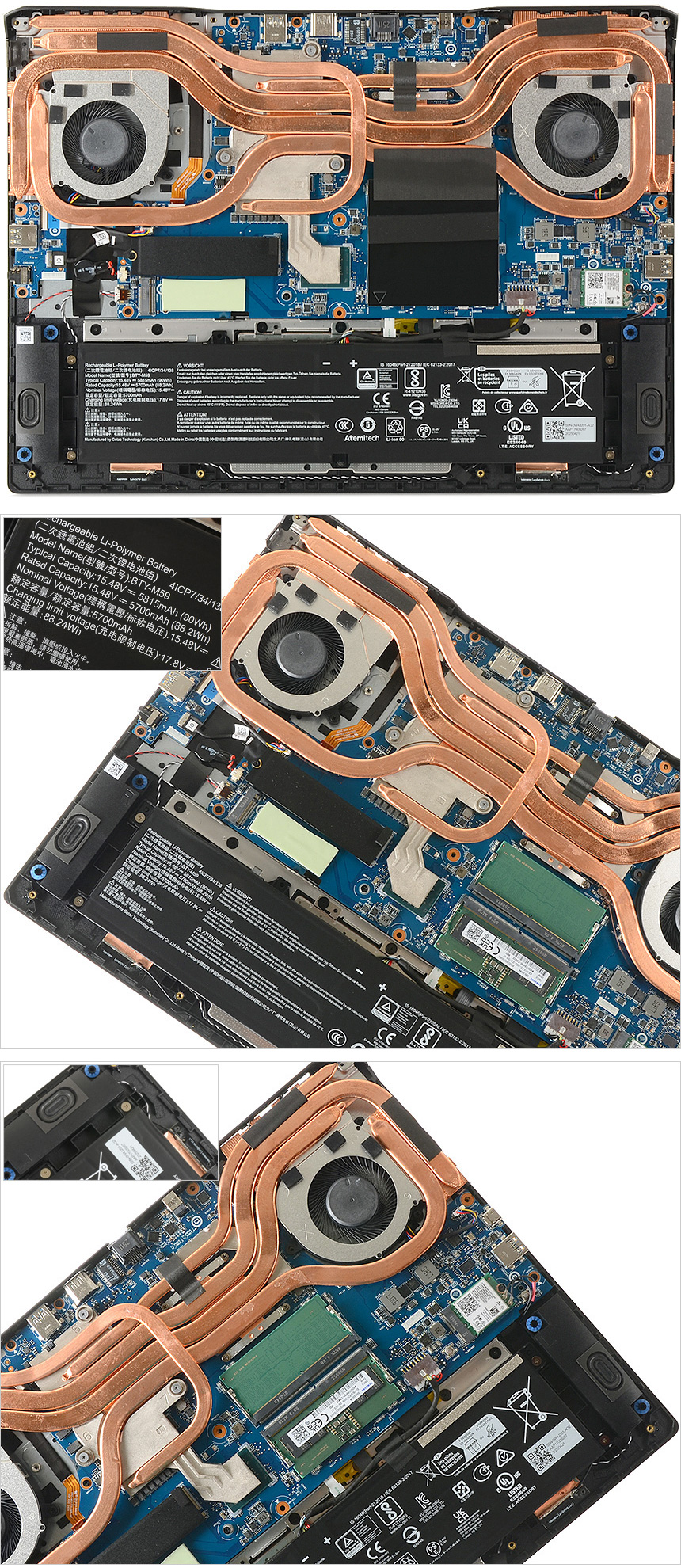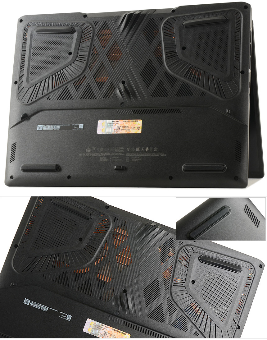 바닥면 내부의 모습으로 2개의 팬과 5개의 히트파이프로 구성된 쿨러부스트5를 지원해 열을 빠르게 식혀주고 뜨거워진 공기는 빠르게 외부로 방출한다. (팬이 최대 속도로 동작해 빠르게 열을 식힐 수 있는 쿨러부스트 기능을 단축키로 제공한다.) 또한 하단에는 5815mAh 용량의 리튬이온 배터리가 설치되어 있고 스피커가 장착되어 있다.