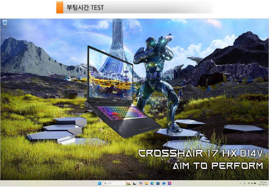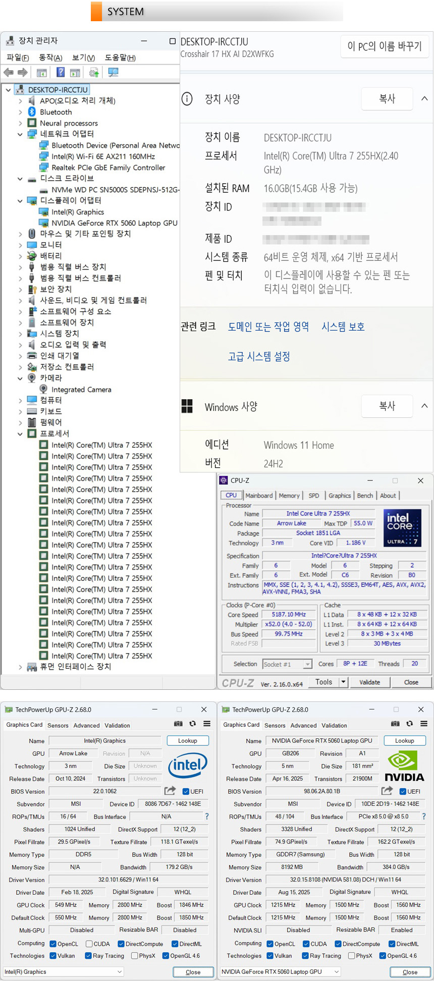 시스템 정보를 확인하고 있는 모습으로 8개의 성능코어에 12개의 효율코어가 더해진 (20 스레드 & 36+30MB 캐시) 인텔코어 울트라 7 프로세서 255HX 가 장착되어 있고 16GB DDR5 듀얼채널 메모리, 512GB NVMe SSD 등을 지원해 빠른 속도를 즐길 수 있다. 뿐만 아니라 RTX 5060 랩탑 GPU가 장착되어 대부분의 게임을 풀옵션으로 즐길 수 있다. 또한 기가비트 유선랜이 설치되어 있고 인텔의 최고급형 Wi-Fi 6E 무선랜카드가 장착되어 빠른 무선속도를 즐길 수 있으며 HD 웹캠이 장착되어 화상회의나 게임방송에서 유용하게 활용할 수 있다.
