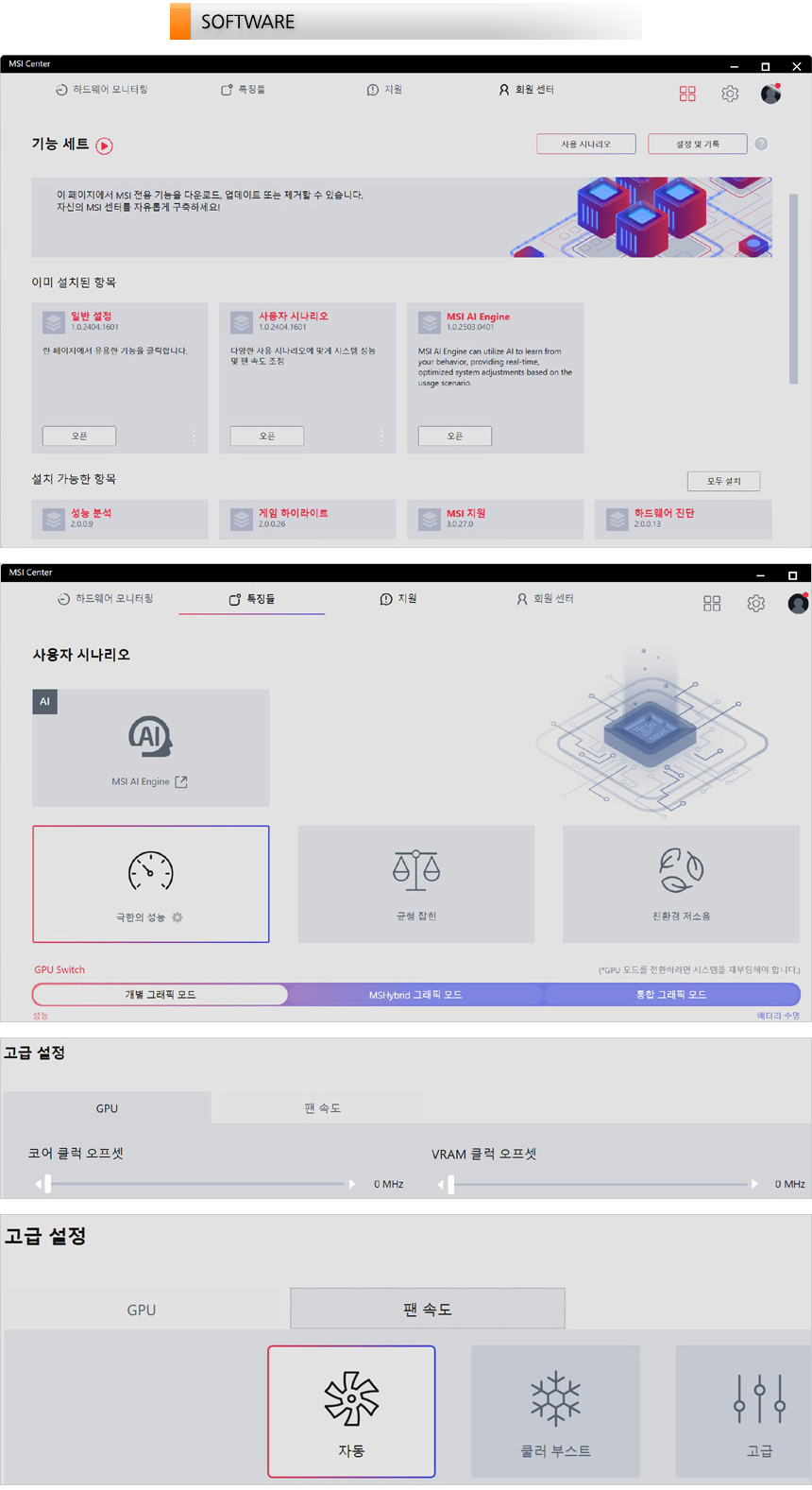 MSI 센터의 실행 모습으로 모듈형 방식을 지원해 사용자가 원하는 S/W를 선택해 설치할 수 있다. 유저 시나리오를 통해 퍼포먼스를 설정할 수 있고 극한의 성능을 선택하면 GPU의 오버클럭이 가능하며 팬속도도 사용자가 원하는 대로 설정할 수 있다. 또한 내장그래픽의 간섭없이 외장그래픽 만으로 게임을 즐길 수 있는 MUX 스위치 기술이 제공되는 것도 눈에 띈다. (긴 배터리 사용시간을 필요로 할 경우 내장그래픽으로 작동하는 통합 그래픽 모드를 선택하기 바란다.)