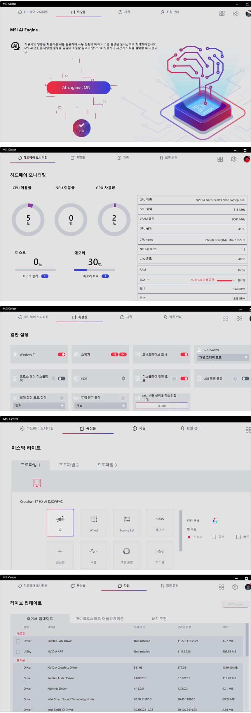 윈도우키와 키보드 백라이트, USB 상시전원 등을 설정할 수 있으며 시스템 업데이트 지원으로 최신의 컨디션을 유지할 수 있다. 또한 AI에 심혈을 기울이고 있는 인텔의 최신 프로세서 탑재된 노트북 답게 AI 기술이 추가된 것을 확인할 수 있으며 (MSI AI 엔진을 선택하면 노트북의 상태와 용도에 따라 최적의 컨디션을 유지할 수 있도록 자동 조절해 준다.) 미스틱 라이트 (조명) 설정도 가능하다.