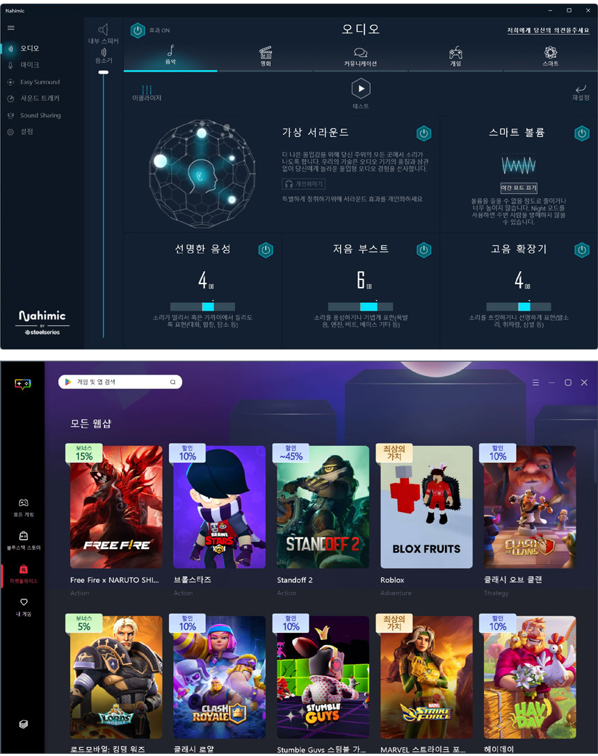 MSI App 플레이어 지원으로 안드로이드 스마트폰에서 사용하던 앱이나 게임을 노트북에서 즐길 수 있으며 나히믹 오디오 지원으로 사용자에 맞는 최적의 음색을 설정할 수 있다. 특히 나히믹에서는 블루투스 스피커 연결시 본체 스피커와 연동해 향상된 입체음향을 제공하는 이지 서라운드 기능이 추가되었다. (프로그램은 MS 스토어에서 설치할 수 있다.)