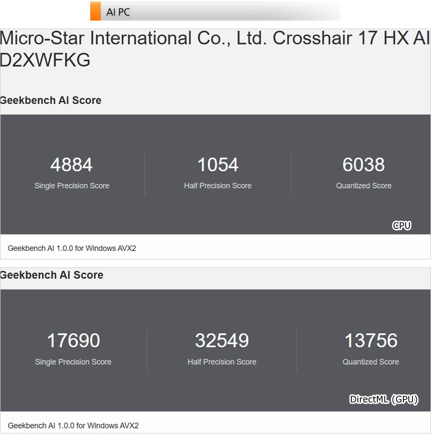 AI 전용 벤치마크 툴을 이용해 AI 성능 테스트를 진행하고 있는 모습으로 최상급의 CPU와 고성능 GPU가 탑재된 모델답게 일반 노트북과 확연하게 비교되는 높은 스코어를 보여주었다. (AI를 통한 개발이나 생성형 AI 용도로 유용하게 사용할 수 있는 노트북이다.)