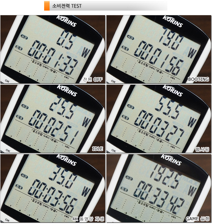 소비전력 테스트를 진행하고 있는 모습으로 (최고성능 모드) 캐주얼한 작업에서는 50W 내외로 작동했다. 또한 게임을 실행하면 최대 220W 까지 소비전력이 상승했으며 대부분의 게임 상황에서 170W~200W 사이로 작동했다.