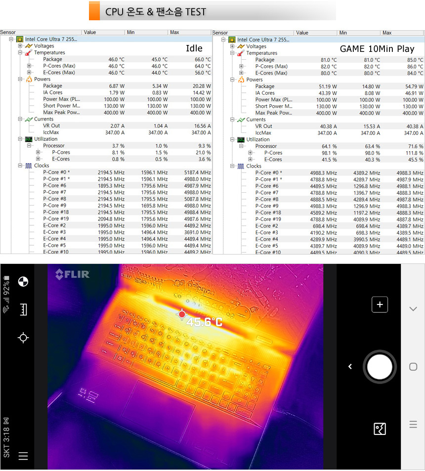 CPU 온도 테스트를 진행하고 있는 모습으로 (실내온도 26도) 아무것도 하지 않는 Idle 상태에서는 40도 중반으로 작동했으며 10분간 게임을 실행했을 때 75~85도 사이에서 온도가 변화하는 것을 확인할 수 있었다. (순간적으로 90도로 올라가곤 했지만 대부분의 상황에서 85도를 넘지 않았다.) 또한 열화상 카메라를 이용해 게임 실행시 노트북의 열분포를 확인하고 있는 모습으로 CPU와 GPU가 설치된 중앙부를 중심으로 열이 자연스럽게 퍼져나가며 측면과 후면의 통풍구를 통해 열이 빠져나가는 것을 확인할 수 있다. 팜래스트 온도는 낮아 열로 인한 스트레스 없이 손을 올려두고 노트북을 사용할 수 있다.
