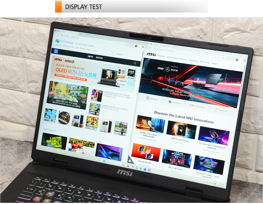 밝고 선명한 디스플레이도 칭찬하지 않을 수 없다. 처음 노트북을 켜는 순간부터 감탄사가 절로 나올정도로 선명도나 디테일이 뛰어났으며 높은 밝기로 실내는 물론 야외에서도 높은 시인성을 보여주었다. 색 재현력도 상당히 뛰어나 작업용으로도 유용하게 활용할 수 있으며 240Hz 주사율을 지원해 게임을 플레이 하면 한차원 높은 부드러움을 경험할 수 있을 것이다. (개인적으로는 디스플레이가 가장 마음에 들었다.)