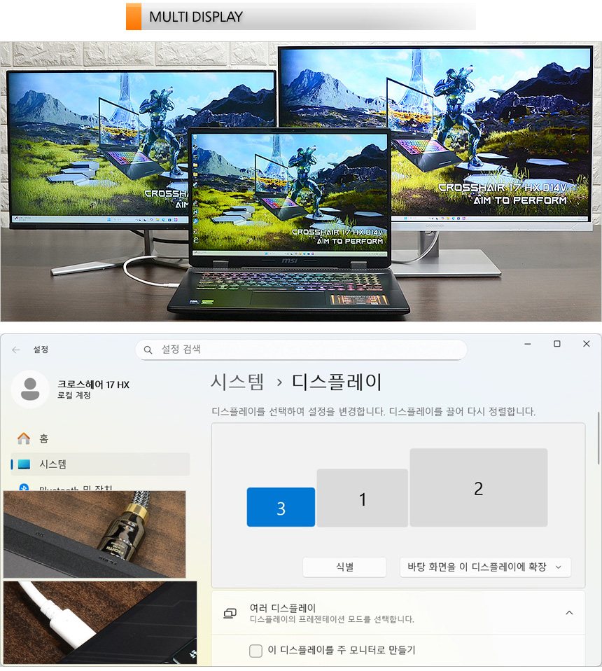 HDMI 뿐만 아니라 썬더볼트 4 단자도 영상 출력을 지원해 총 3개의 디스플레이를 사용할 수 있다. 다중창 사용이 필수적인 업무나 학습용으로도 유용하게 활용할 수 있으며 4K 모니터 연결도 가능해 전문작업도 용이하게 실행할 수 있다. (3개의 디스플레이를 활용하고자 할 경우 그래픽을 MS하이브리드로 설정하기 바란다.)