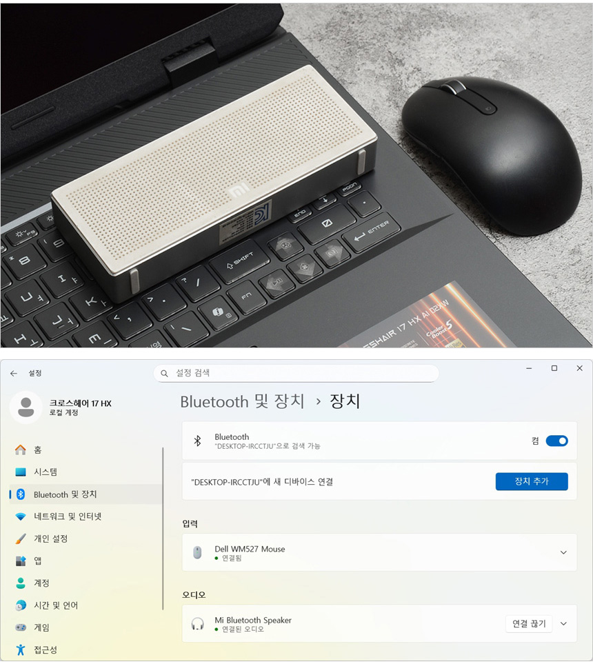 블루투스를 지원해 다양한 액세서리를 무선으로 연결할 수 있다. 상단의 사진은 스피커와 마우스의 연결 모습으로 원활하게 페어링 되는 것을 확인할 수 있었으며 완벽하게 작동했다.