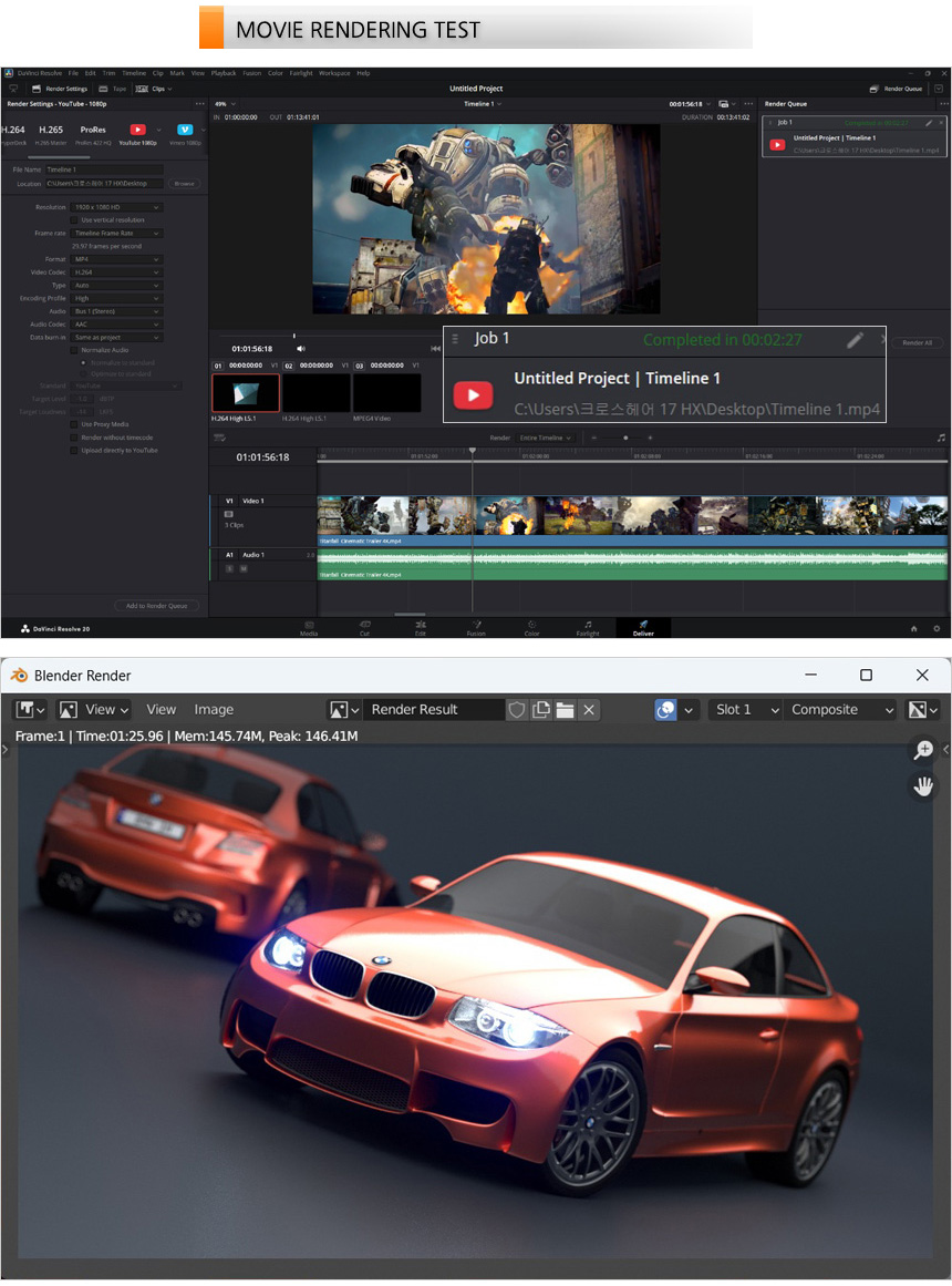 영상편집 S/W 다빈치 리졸브를 이용해 랜더링 테스트를 진행하고 있는 모습으로 (640MB, 920MB, 990MB 4K 동영상을 단일 동영상으로 랜더링, FHD 해상도에 H.264 비디오 코덱) 2분 27초가 소요되는 것을 확인할 수 있었다. 또한 블랜더 랜더링 테스트 에서는 1분 25초가 소요되었다. @ 최상급의 CPU를 사용한 모델답게 보급형 게이밍 노트북과는 확연한 차이를 보여주었다. 영상편집은 각종 랜더링 용도로 편하게 사용할 수 있다.