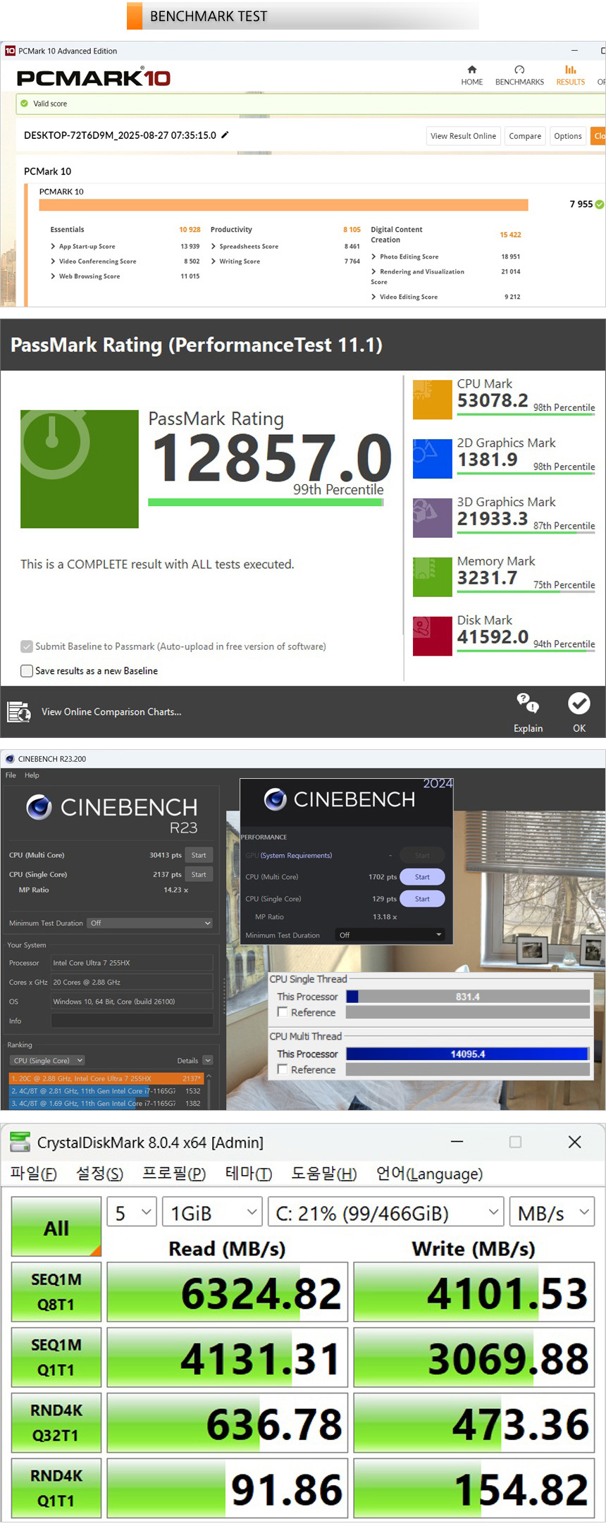 벤치마크 프로그램을 이용해 성능 테스트를 진행하고 있는 모습으로 일반 노트북과 비교되는 높은 스코어를 보여주었다. (특히 프로세서의 스코어가 아주 마음에 든다.) 게이밍은 물론 전문가용 S/W를 구동하는 용도로도 충분히 활용할 수 있을 것이다. 또한 저장장치의 속도를 확인해 보았는데 PCIe Gen4 SSD가 장착되어 확연히 빠른 속도를 보여주었다.