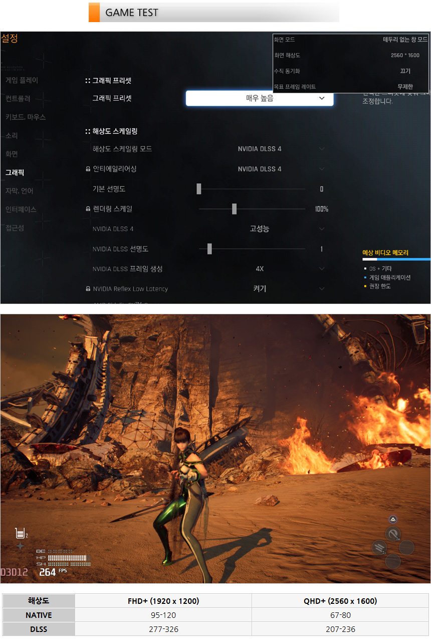 대작게임 스텔라 블레이드를 플레이 하고 있는 모습으로 DLSS를 사용하지 않아도 플레이가 가능하다. DLSS를 활성화 하면 QHD+ 에서도 200프레임 이상을 확보할 수 있어 부드럽게 게임을 플레이 할 수 있다. (DLSS 의 경우 프레임 생성을 4X로 설정했다.) @ 스텔라 블레이드는 어지럼증이 발생할 수 있는 게임이다. 꼭 DLSS를 확보해 높은 주사율의 장점을 활용하기 바란다.