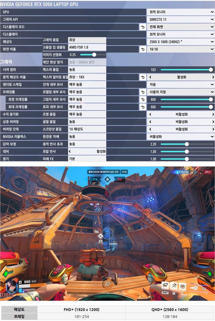 오버워치2를 이용해 게임 테스트를 진행하고 있는 모습으로 최상 옵션을 설정했을 때 QHD+ 기준 100프레임 중반대로 게임이 가능하다. 옵션을 낮춰 프레임을 최대로 확보하면 더 부드러운 영상으로 게임을 즐길 수 있을 것이다.