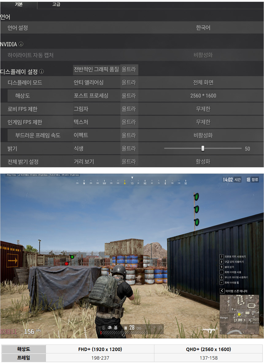 배틀그라운드를 플레이 하고 있는 모습으로 울트라 옵션 설정시 FHD+에서는 200프레임 이상으로 플레이가 가능했으며 QHD+ 해상도에서는 100프레임 중반대로 플레이 되었다. 옵션을 낮추면 더 부드러운 게임영상을 즐길 수 있을 것이다.