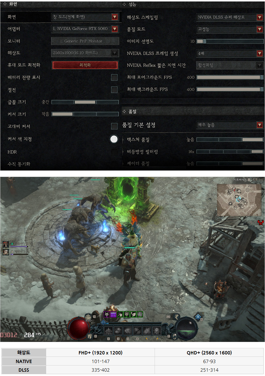 디아블로 4를 매우 높음 옵션으로 플레이 하고 있는 모습으로 DLSS를 사용하지 않고 충분히 게임을 즐길 수 있다. 단, DLSS를 활성화 하면 프레임이 확연하게 높아지기 때문에 DLSS를 사용하고 프레임을 생성해 게임을 즐기기 바란다. (프레임 생성을 4배로 적용하면 QHD+ 에서도 240Hz 활용이 가능하다.)