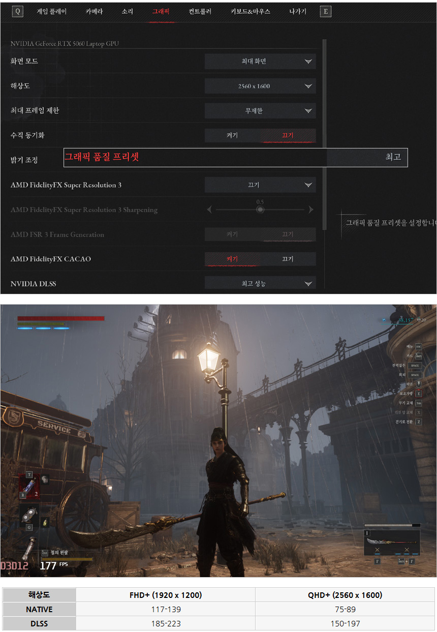 P의 거짓을 최고 옵션에서 플레이 하고 있는 모습으로 디아블로 4와 같이 부드럽게 게임을 즐길 수 있었다. (DLSS를 활성화 하면 프레임이 대폭 상승한다.)