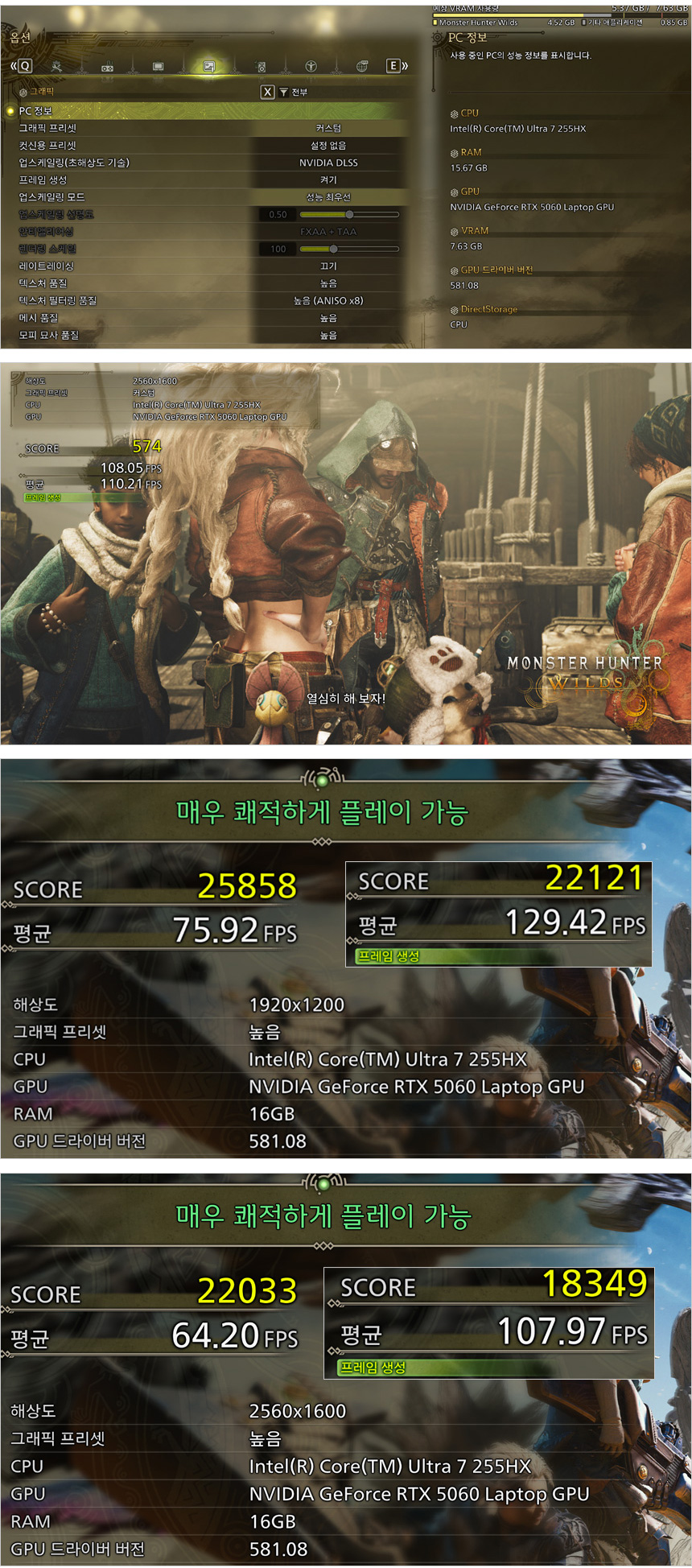 몬스터 헌터 와일드 벤치마크를 높음 옵션으로 실행한 모습으로 (VRAM 이 8GB 이하의 제품은 울트라 옵션 적용이 쉽지 않다.) 해상도에 상관없이 쾌적하게 게임을 즐길 수 있다. (DLSS를 적용하는 것을 추천한다.)