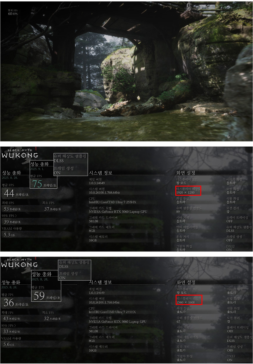 검은신화 오공 벤치마크를 울트라 옵션에서 실행한 모습으로 기본 설정에서는 프레임이 높지 않지만 DLSS를 이용해 프레임을 생성하면 성능이 높아져 더 부드럽게 게임을 즐길 수 있다.