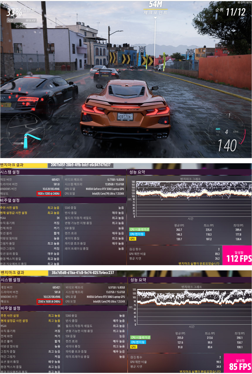 포르자 호라이즌 5를 최고 옵션으로 설정해 실행한 모습으로 QHD+ 해상도에서도 높은 프레임을 보여주었다. 해상도나 옵션에 상관없이 부드럽게 게임을 즐길 수 있을 것이다. (DLSS를 사용하면 더 부드럽게 게임을 즐길 수 있다.)