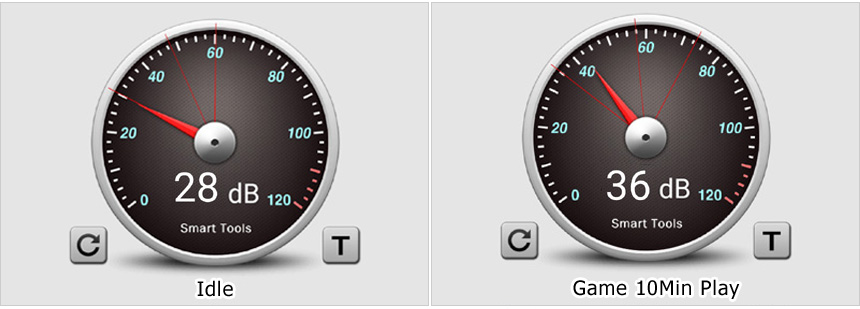 팬소음 테스트도 진행했는데 아이들이나 캐주얼한 작업에서는 생활소음에 묻혀 팬소음이 거의 들리지 않았으며 게임을 실행하면 듀얼팬이 빠르게 동작해 팬소음이 커지기는 했지만 스피커 사운드에 묻혀 크게 신경쓰이지 않았다. @ 측정값은 순수한 팬소음이 아니고 팬소음을 포함한 사무실의 생활 소음이다. 이점 참조 바란다.