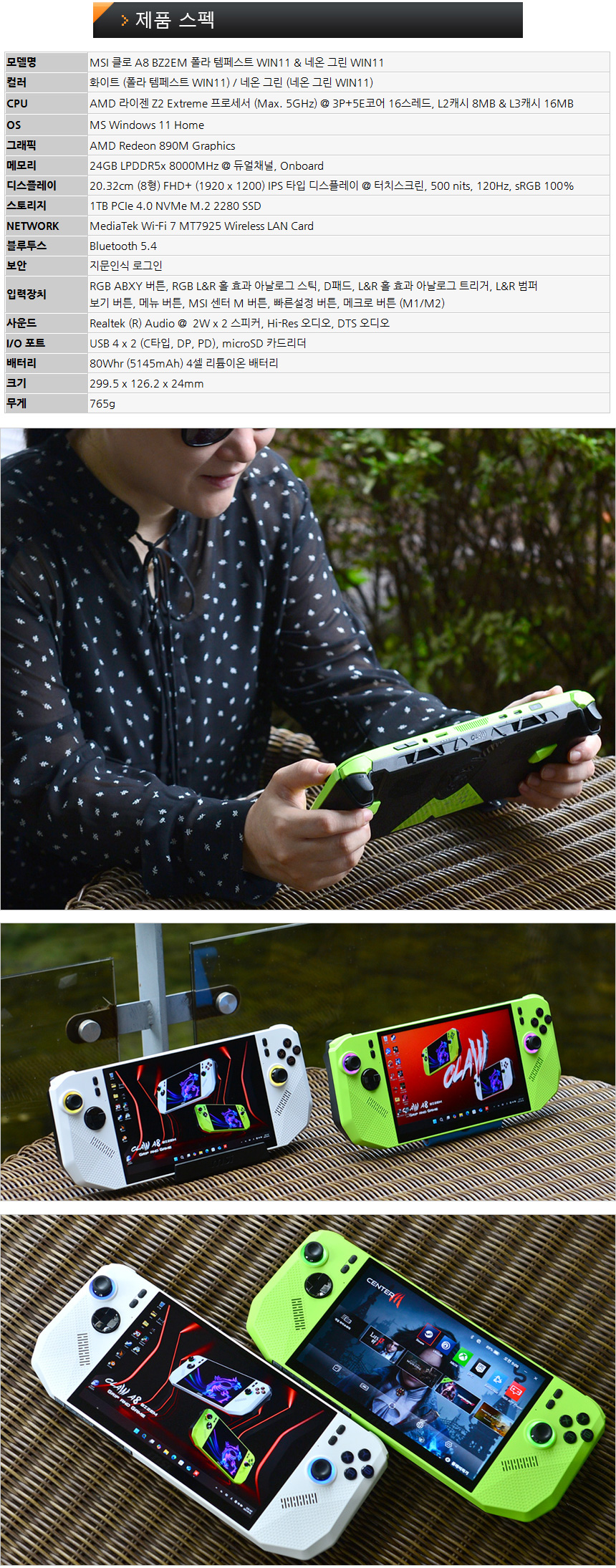 이번에 리뷰를 진행 할 MSI 클로 A8 BZ2EM 은 MSI 최초의 AMD 기반 게이밍 UMPC로 강력한 성능과 선명한 대화면을 선호하는 유저들을 위한 최고급형 모델이다. AMD 라이젠 Z2 Extreme 프로세서와 24GB 듀얼채널 메모리로 보급형 모델들을 압도하는 강력한 성능을 경험할 수 있으며 FSR 뿐만 아니라 RSR, RIS, AFMF 등의 최신 기술을 통해 쾌적하게 게임을 플레이 할 수 있다.