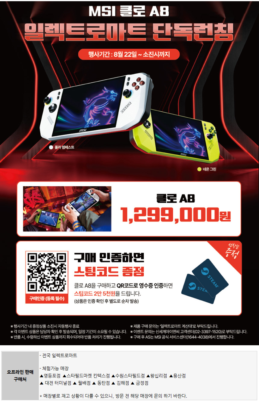 온라인에서 판매되는 일반 디지털 기기들과 달리 MSI 클로 A8 BZ2EM은 오프라인 에서만 구입이 가능하다. 접근성이 뛰어난 전국 일렉트로마트 매장에서 제품을 판매하고 있어 편하게 구입할 수 있을 것이다. (체험가능 매장을 지원해 직접 만져보고 구입할 수 있다.) 현재 선착순 이벤트를 진행하고 있는점 참고하기 바란다.