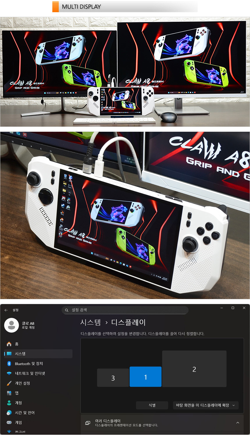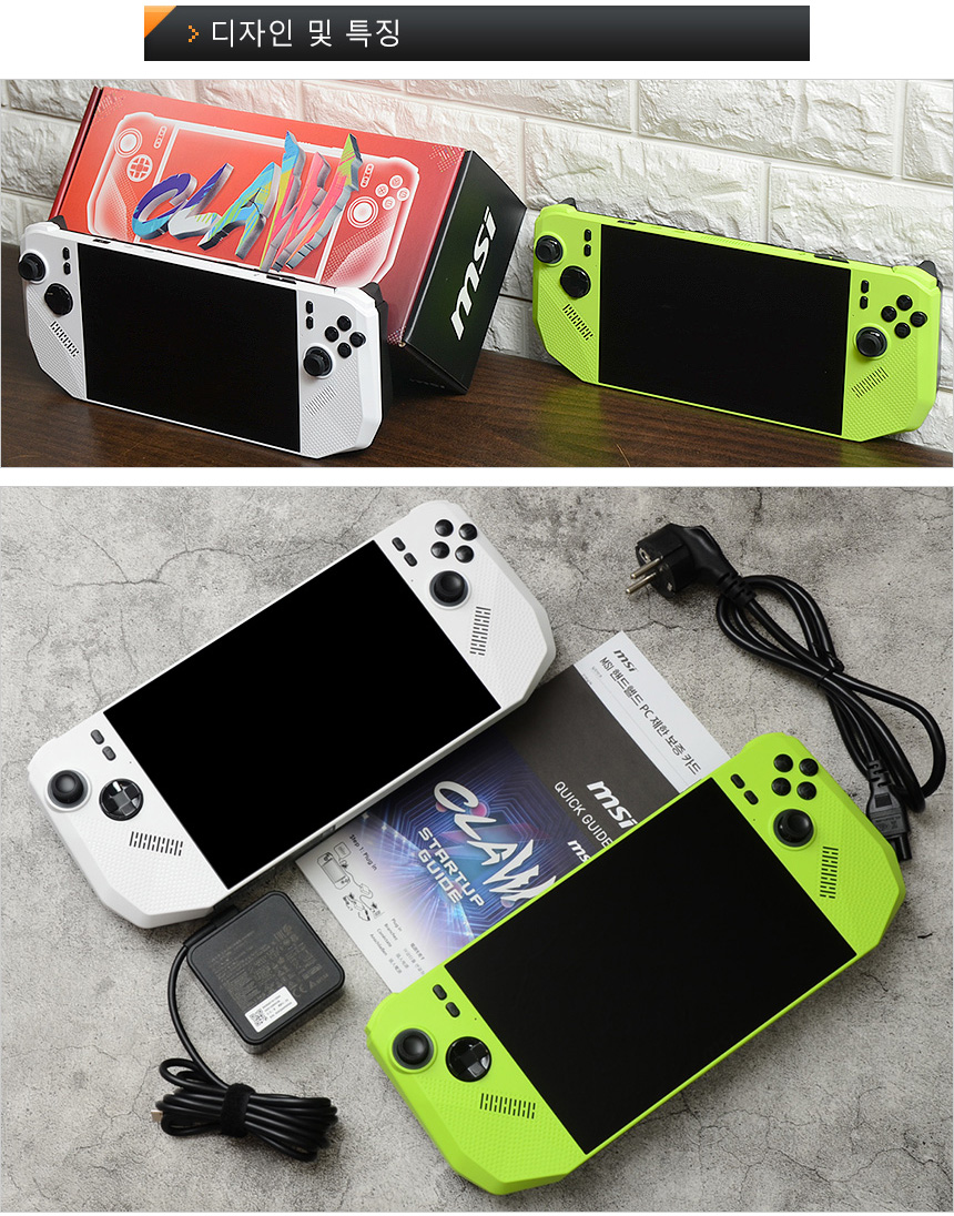 인텔코어 울트라 200 시리즈 프로세서를 탑재한 클로 8 AI+ 와 마찬가지로 8형 대화면을 지원하지만 무게를 줄여 휴대성을 한층 높였다. (참고로 MSI 클로 8 AI+ A2VM-U7 의 노트포럼 측정 무게는 791g 이었다.) 특히 손잡이 부분에 굴곡을 적용해 자연스럽게 쥐고 아날로그 스틱이나 트리거 등을 누를 수 있으며 장시간 게임 플레이로 피로감이 쌓일 경우 책상에 손을 올려두고 게임을 즐기면 피로감을 최소화 할 수 있다.