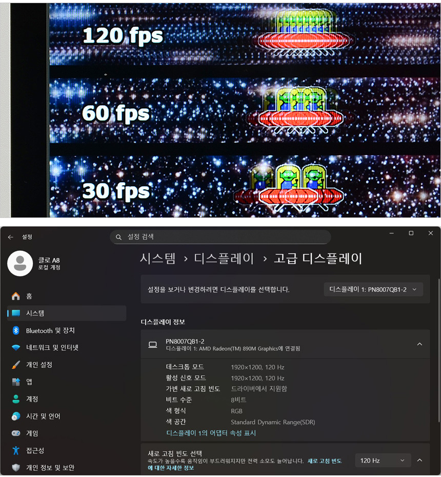 120Hz 주사율을 지원해 부드러운 영상을 즐길 수 있다. 상단의 사진은 주사율에 따른 캐릭터 움직임을 카메라로 촬영한 모습으로 하위 프레임과 확연한 차이를 보여주고 있다. 최근 출시되는 스마트폰이 90Hz 나 120Hz를 지원하는 것은 특유의 부드러운 화면 전환 때문이다. 이 제품도 60Hz 지원 제품들과는 확연히 다른 부드러움을 경험할 수 있다.
