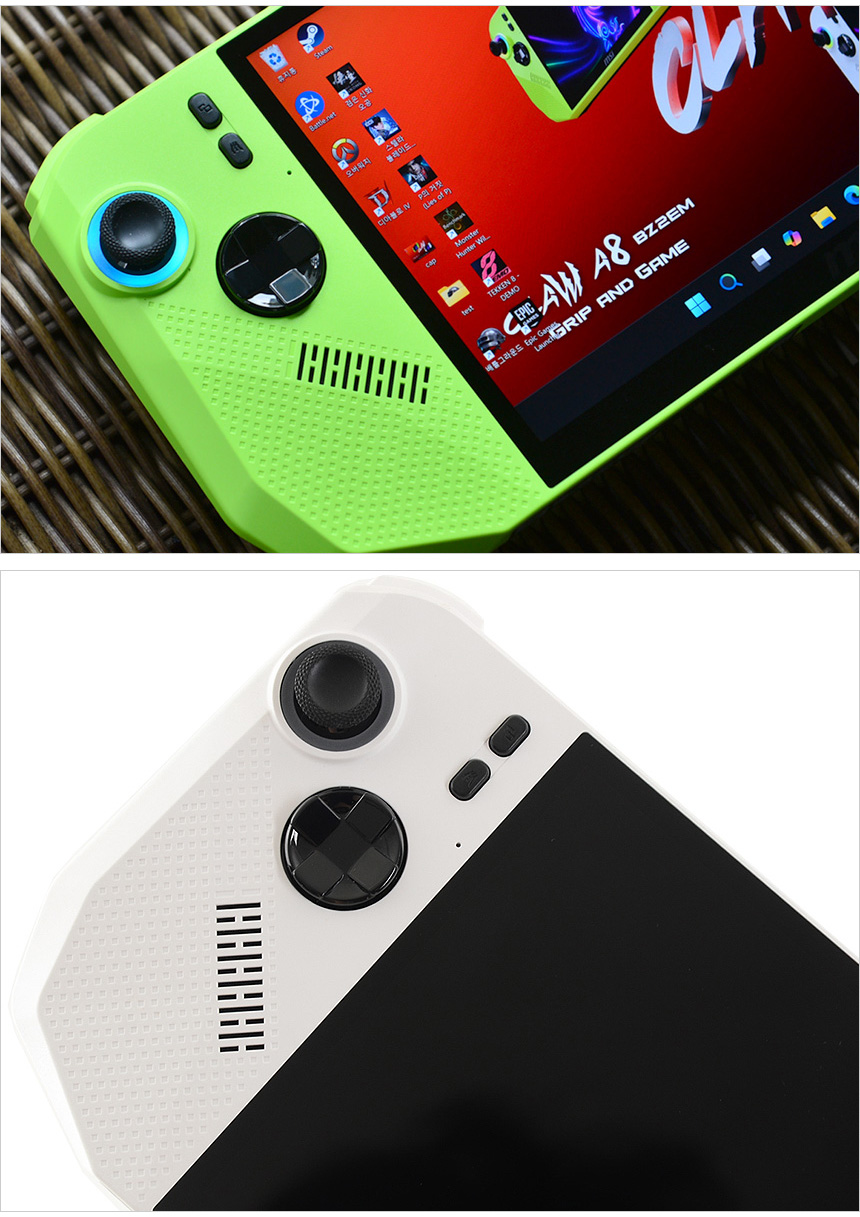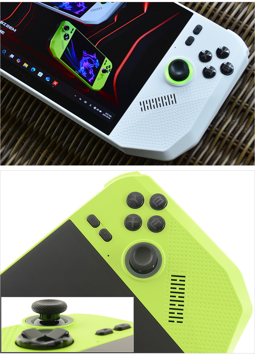 전면 우측면의 모습으로 좌측과 마찬가지로 스피커와 아날로그 스틱이 설치되어 있고 게임 플레이를 위한 ABXY 버튼이 설치된 것을 확인할 수 있다. 또한 측면에는 게임 설정등을 위한 메뉴 버튼을 비롯해 빍기나 소리등 주요 기능을 빠르게 설정할 수 있도록 빠른설정 버튼을 제공한다. (조이스틱은 다이아몬드 패턴의 테두리와 오목한 중심부 설계로 안정적으로 엄지 손가락을 올려두고 컨트롤 할 수 있다.)