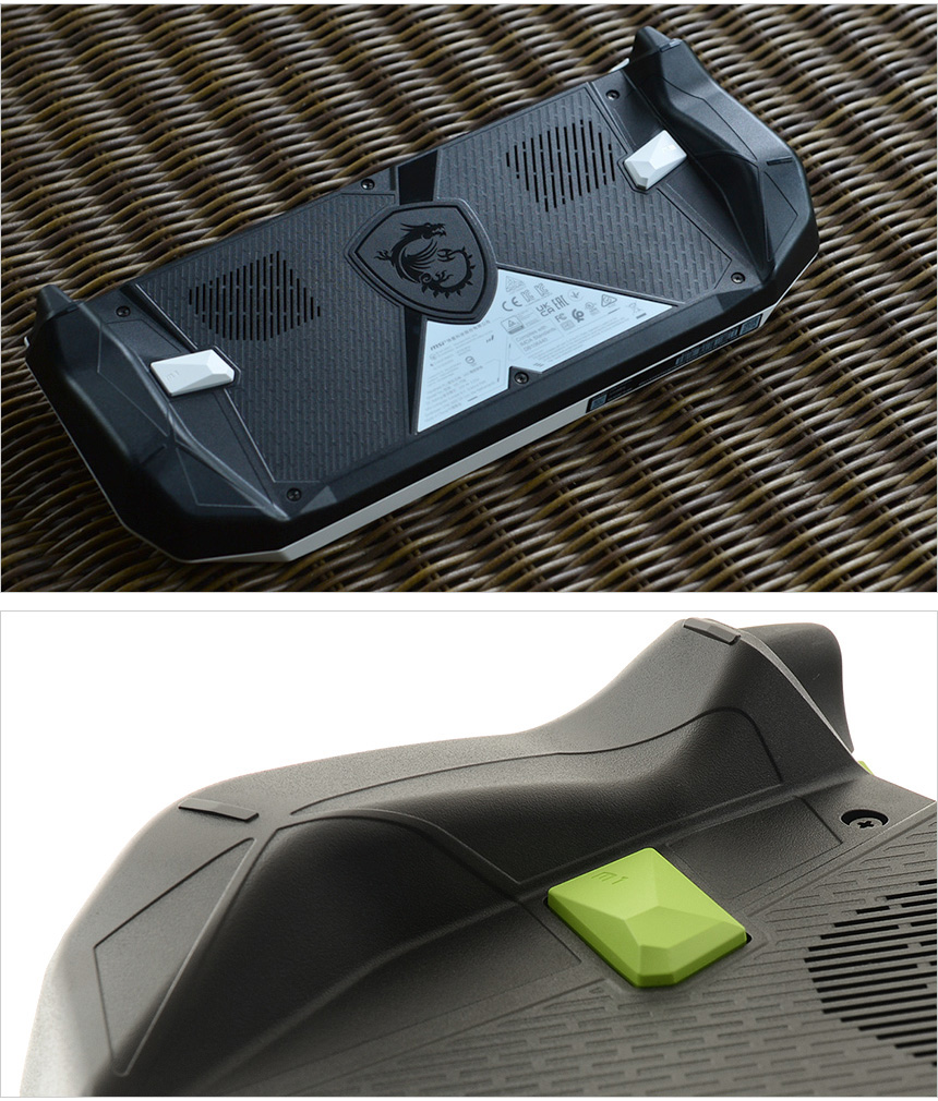 바닥면의 모습으로 원활한 공기 유입을 위해 팬이 설치된 부분에 통풍구가 설치되어 있고 그립감을 높이기 위해 깊은 굴곡이 형성된 것을 확인할 수 있다. 또한 편하게 게임을 즐길 수 있도록 2개의 매크로 버튼을 제공한다. (전용 S/W를 통해 기능을 지정할 수 있다.)