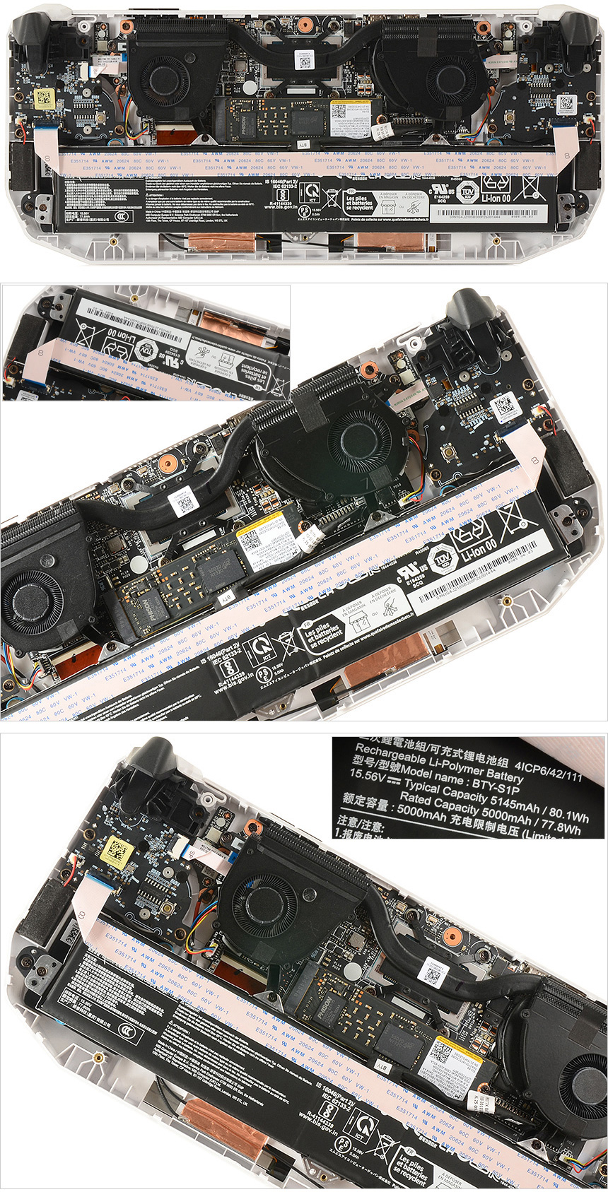 제품 내부의 모습으로 열을 효과적으로 식혀줄 수 있도록 듀얼팬과 히트파이프가 장착된 것을 확인할 수 있으며 하단에는 51450mAh 대용량 배터리가 설치된 것을 확인할 수 있다. 또한 24GB LPDDR5X 메모리가 빌트인 되어 있으며 스피커와 WI-Fi 안테나가 하단에 설치된 것도 눈에 띈다.