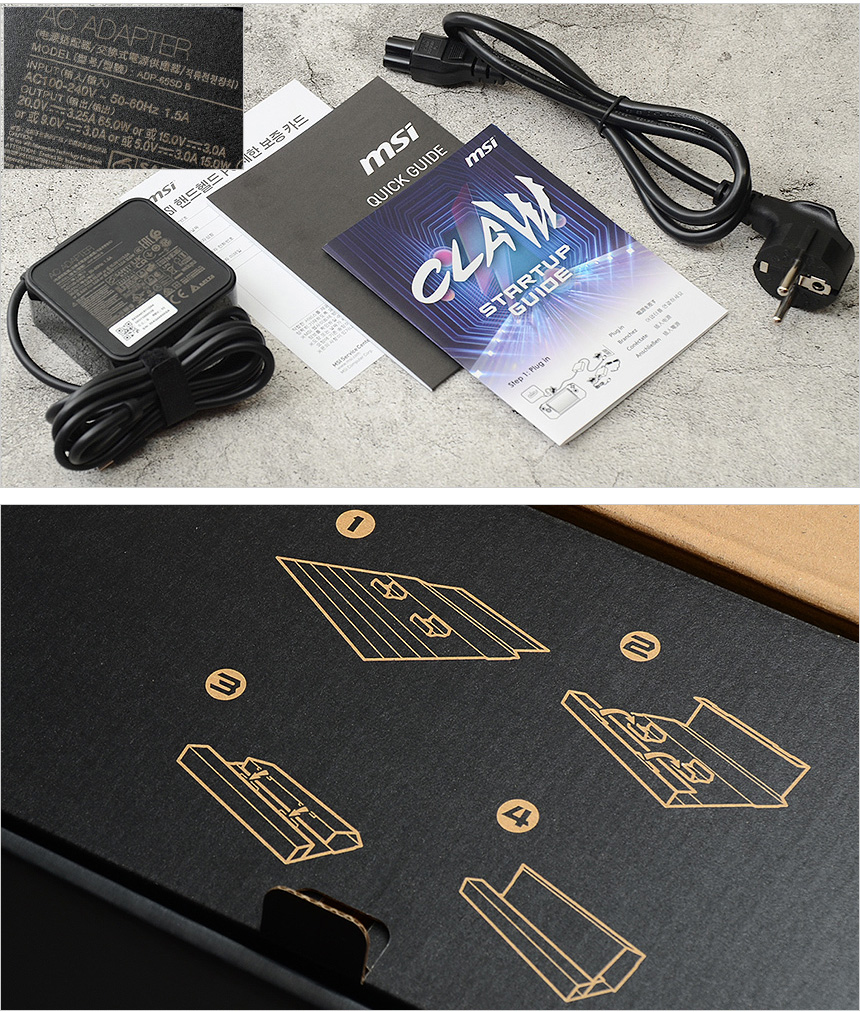 기본 제공되는 액세서리의 모습으로 C타입의 65W 전원 어댑터와 전원 케이블, 스타트 가이드, 퀵 매뉴얼을 제공한다. (전원 어댑터는 다양한 전압을 지원해 스마트폰 충전용으로도 활용할 수 있다.) 또한 박스를 스탠드로 만들어 사용할 수 있다.