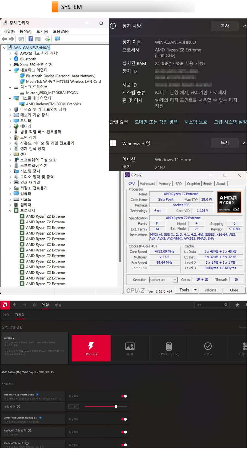 시스템 정보를 확인하고 있는 모습으로 게이밍 UMPC와 같은 휴대용 디바이스에 특화된 AMD 의 라이젠 Z2 익스크림 프로세서가 탑재된 것을 확인할 수 있다. 8코어 16스레드 기반에 라데온 890M 내장그래픽을 지원해 하위 라인업과는 분명한 3D 성능차를 경험할 수 있을 것이다. 또한 인텔 Wi-Fi 7 무선랜카드를 장착해 빠른 무선속도를 즐길 수 있으며 지문인식 센서가 장착되어 중요 자료를 안전하게 보관할 수 있다. 뿐만 아니라 윈도우 11 Home 을 기본 지원해 번거로운 셋팅 작업 없이 구입즉시 사용할 수 있다. (참고로 AMD 아드레날린에서 HYPR-RX를 선택해 주면 프레임을 향상시켜 주는 각종 기술이 활성화 되어 좀더 쾌적하게 게임을 즐길 수 있다.)