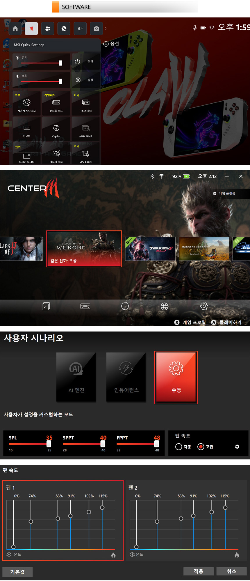 사용자 시나리오는 자동으로 사용환경을 분석해 최적의 성능으로 작동하는 AI 엔진을 비롯해 배터리 소모를 최소화 하는 인듀어런스를 지원하며 수동 모드를 제공해 사용자가 전압과 팬속도를 조절할 수 있다. (최고 성능에서 안정적으로 게임을 즐기고 싶다면 수동모드에서 SPPT와 FPPT는 최고로 설정하고 SPL은 32~33 정도로 설정하기 바란다.)