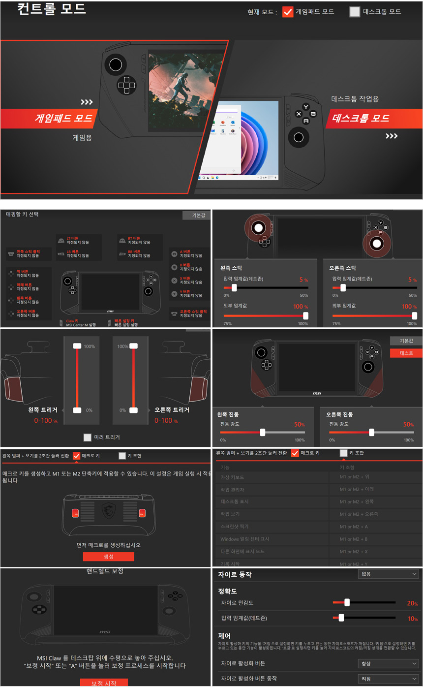 노트북과 달리 게이밍 UMPC에 특화된 MSI 센터 M을 제공해 편의성을 높였다. 손쉽게 게임을 선택할 수 있도록 아이콘이나 인터페이스가 구성되어 있으며 전용 버튼을 지원해 손쉽게 실행할 수 있다. 또한 빠른 설정을 지원해 주요 기능을 편하게 조정할 수 있으며 사용자 시나리오 지원으로 퍼포먼스를 원하는 대로 조정할 수 있다.